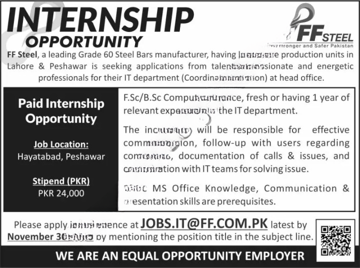 Official Advertisement for FF Steel Internship Jobs