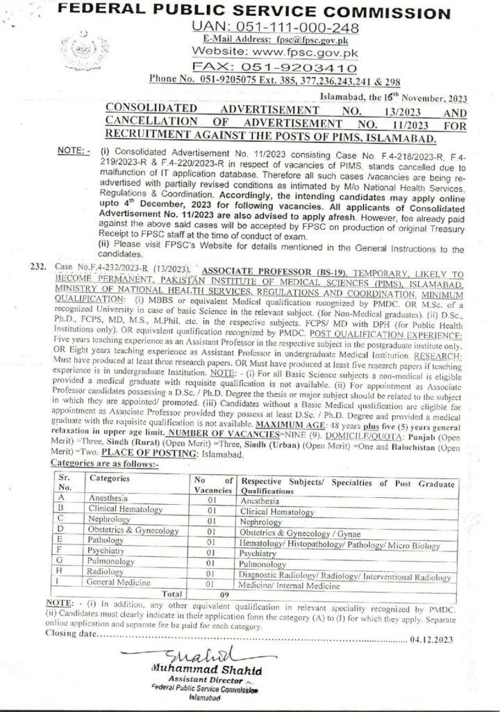 The last date to apply online for FPSC Jobs is 04th December 2023.